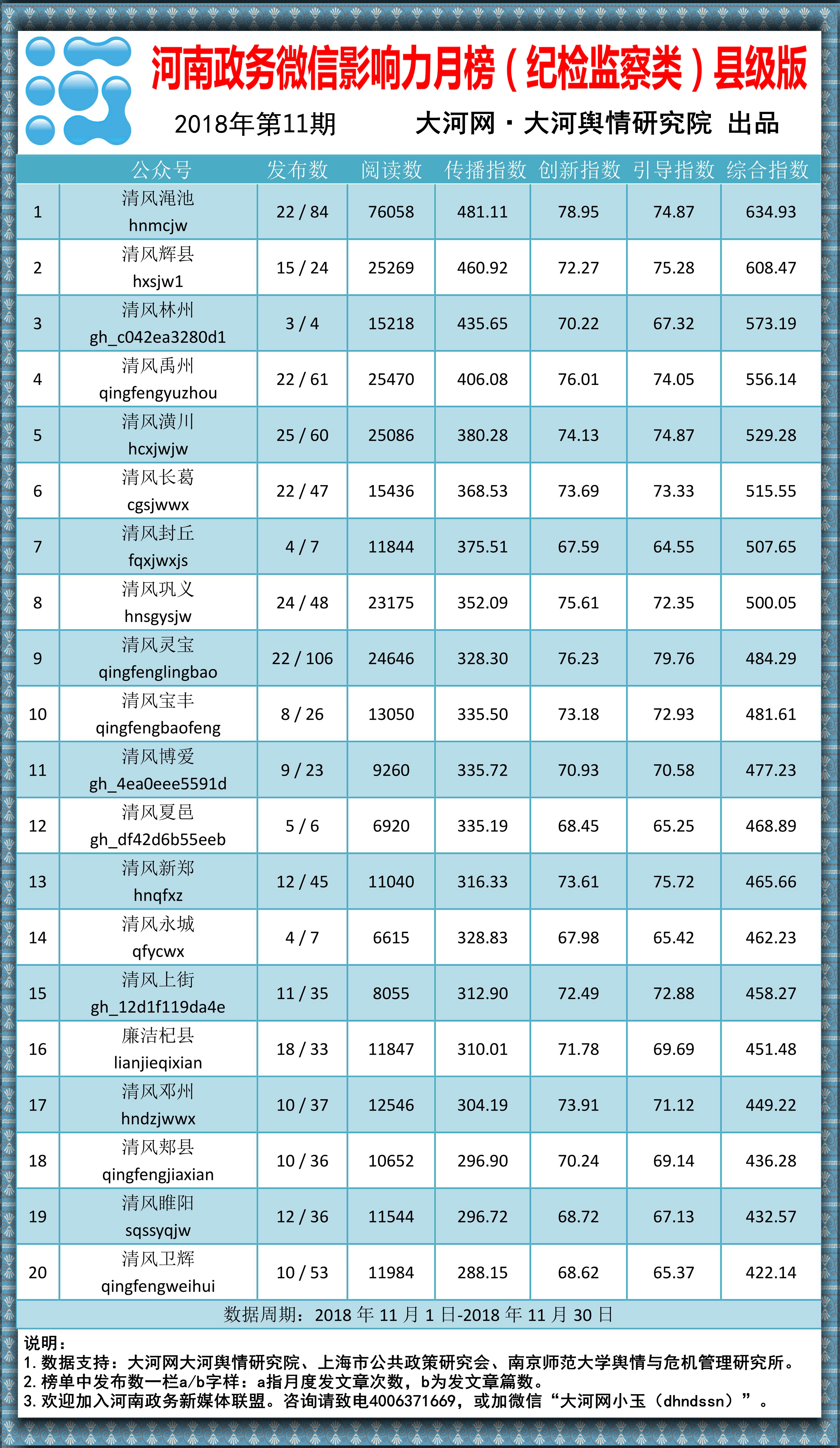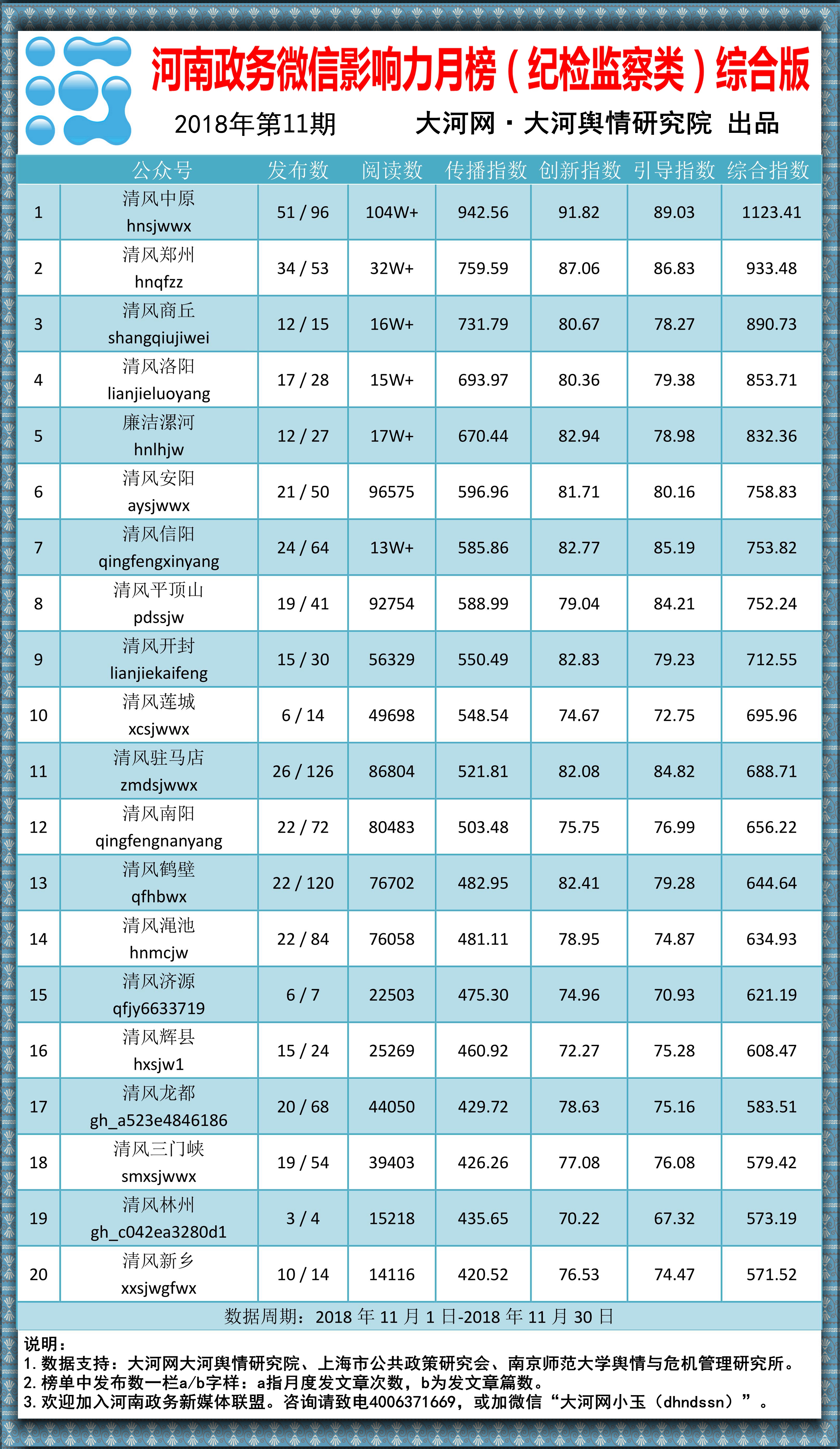 本榜单由大河网络传媒集团政务运维中心、大河网大河舆情研究院联合制作,监测对象覆盖了河南省境内较为活跃的政务微信(纪检监察类),监测周期为2018年11月1日至30日。如您有意推进智慧政务建设,或有意自荐将您所属政务微信公号(纪检监察类)列入监测范围,请致电大河网客服电话:400-637-1669。(熊孟元 孙轲轲)