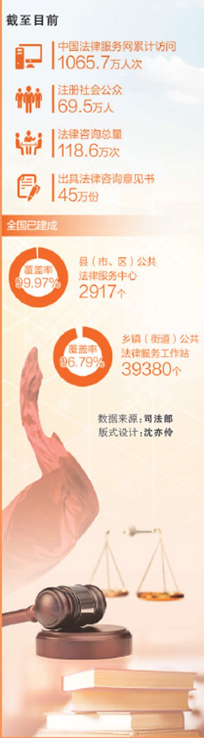 目前,全国已建成县(市、区)公共法律服务中心2917个、乡镇(街道)公共法律服务工作站39380个,覆盖率分别达到99.97%和96.79%;各省(区、市)均已建成热线平台,有31个省份实现了省级统筹;各省(区、市)均已建成网络平台,并实现与中国法律服务网互联互通。