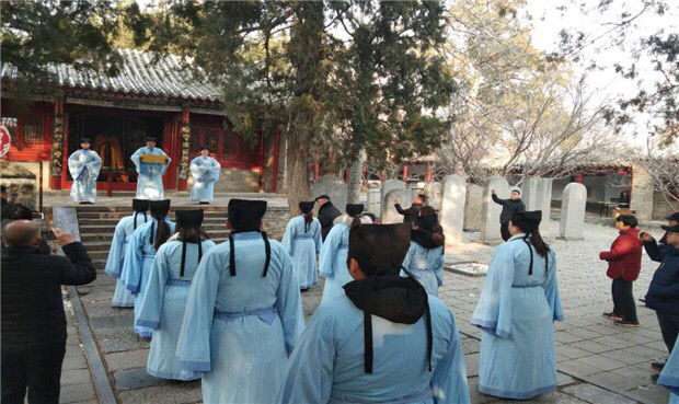 奏古乐、着汉服、行古礼,农历大年初一,在嵩阳书院先圣殿前举行拜孔祈福仪式,正衣冠、读拜文、诵经典,传统礼仪在书院中重现,体现尊师重道的书院精神。