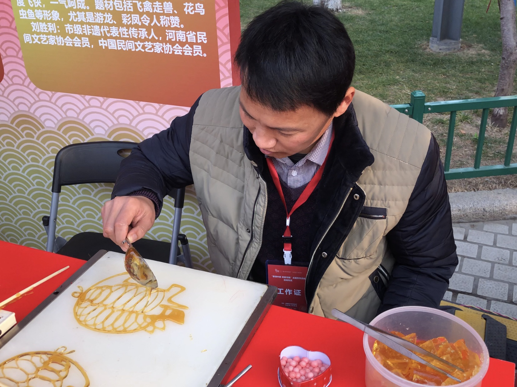 大河网讯(记者 莫韶华)给他一张照片,他就能做出一个糖画。他经常参加各种文化活态展示活动,现场表演如何用一把铁勺进行作画。这不,临近年关,各种文化活动都多起来了,在刘胜利的糖画柜台前,一条红黄相间的龙腾空飞舞,栩栩如生,吸引了不少市民驻足观看。来自郑州市惠济区老鸦陈办事处师家河村的刘胜利告诉记者,"制作这条龙大概需要半个小时,普通的空心‘龙’形态的糖画两分钟就能完成。"