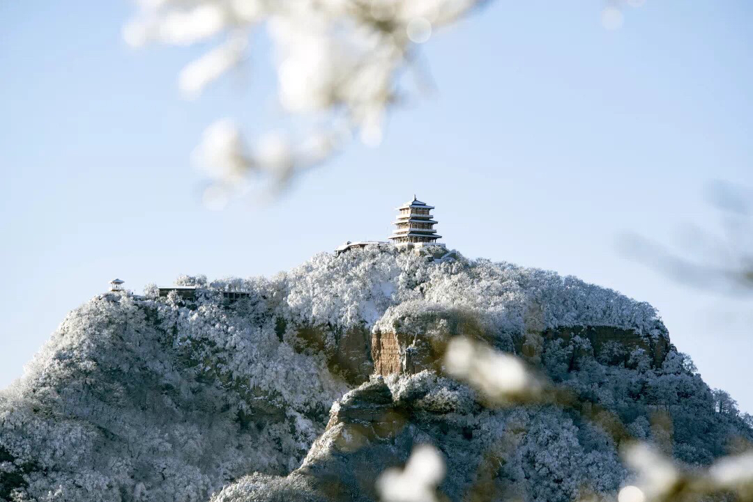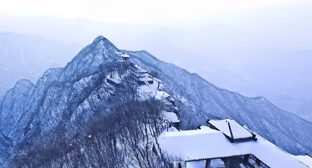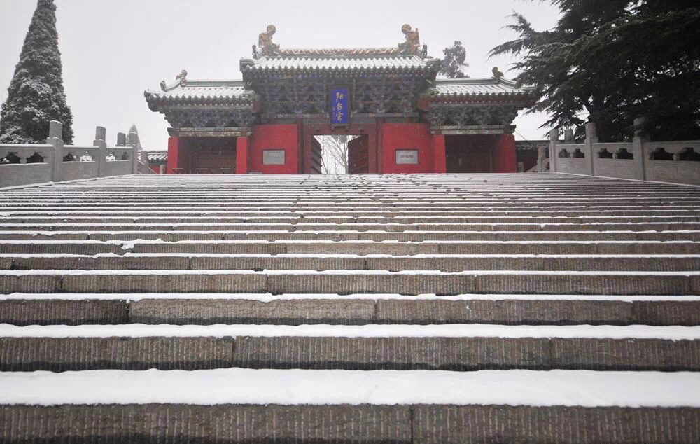 大年初三一大早,王屋山上零星的小雪便开始飘洒起来,山川,树木,建筑全部都笼上了一层莹白,路边的青松在雪中显得更加挺拔,松针上缀满银花。极目远望,仿佛变成了一个粉妆玉砌的世界。