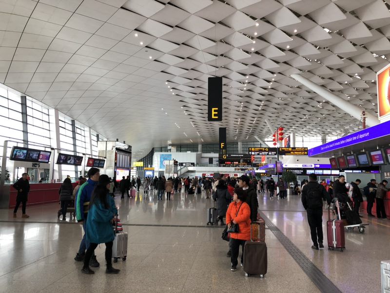 七天假期,探亲访友、外出旅游的旅客较多,2月4日至7日客流明显回落,2月8日至10日客流明显回升。假期天气以晴朗居多,也偶有冰雪袭扰,机场各保障单位协同联动,全力做好除冰雪和旅客服务工作,尽可能使广大旅客安全、顺畅、温暖出行。在T2航站楼出发大厅,越来越多的旅客选择“无纸化”乘机,特别是春节前投用的全自助一体机备受青睐,平均每天办理行李托运约3000件。