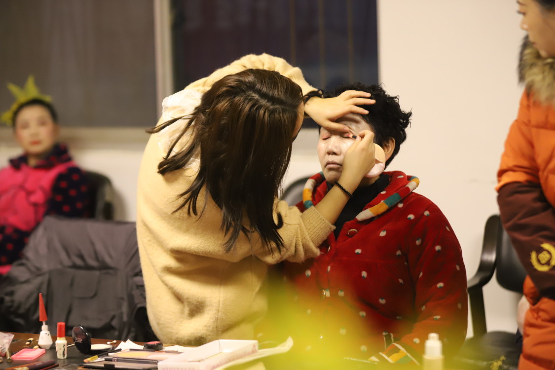 在化妆现场,村民们搽脂抹粉,头上还戴着喜庆的花,个个喜笑颜开,每个人都在期待着大巡游的开始。