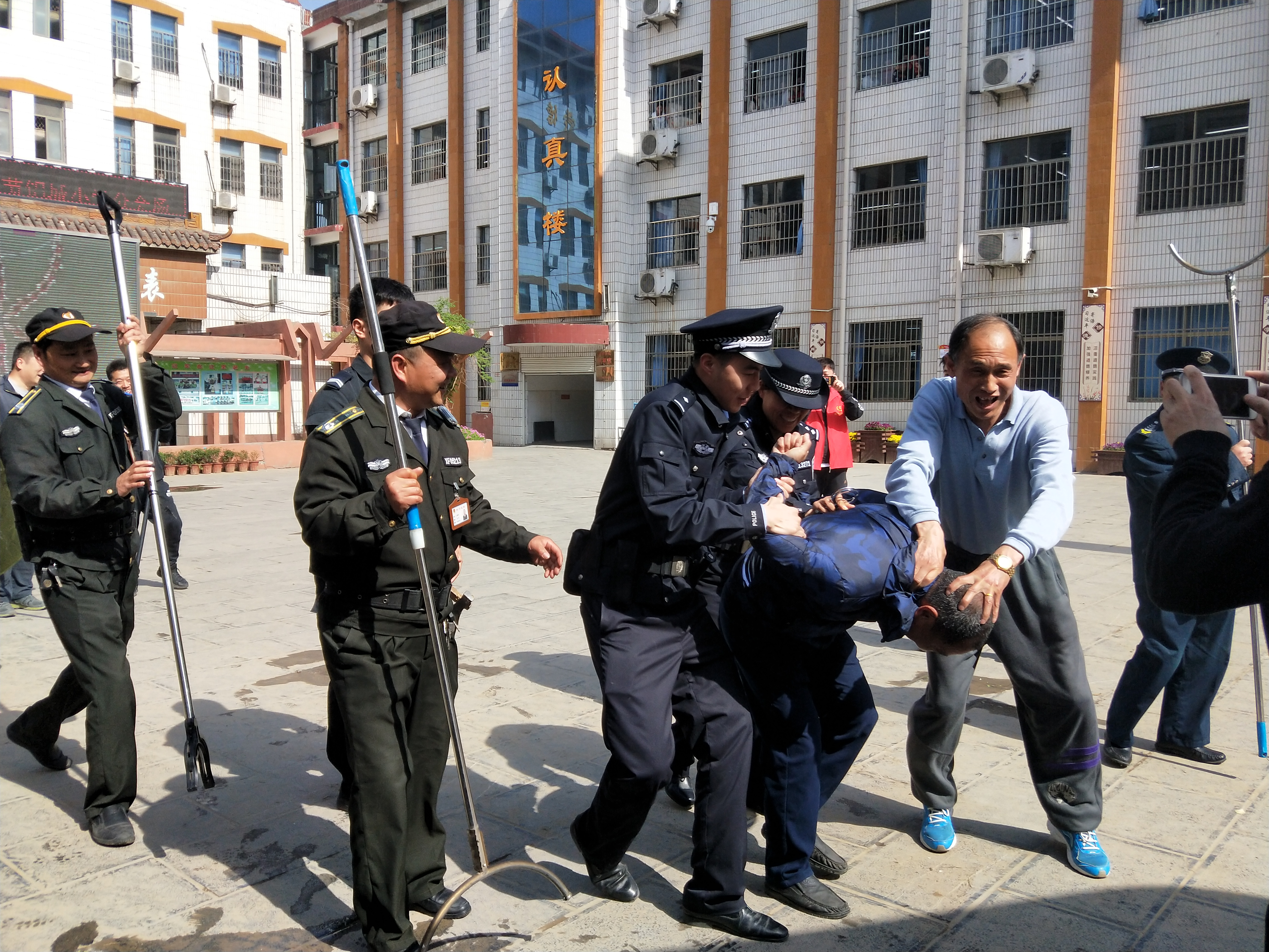 演练以学校突遇不明人员入侵并袭击师生为模拟场景,上午九时,演练正式开始,两名男子试图进入校园,学校保安要求男子登记并联系老师,两名男子拿出身上携带的刀、斧,突然硬闯校园,两名保安快速反应,手持防爆器材、棍棒等工具与“歹徒”周旋。与此同时,老师迅速将校内学生疏导到安全区域,并立即拨打110报警。2分钟后,我所民警赶到现场,发现情势十分危急,当即兵分两路对“歹徒”展开拦截和追捕,利用钢叉、盾牌等工具一举把“歹徒”制服,现场秩序恢复正常。