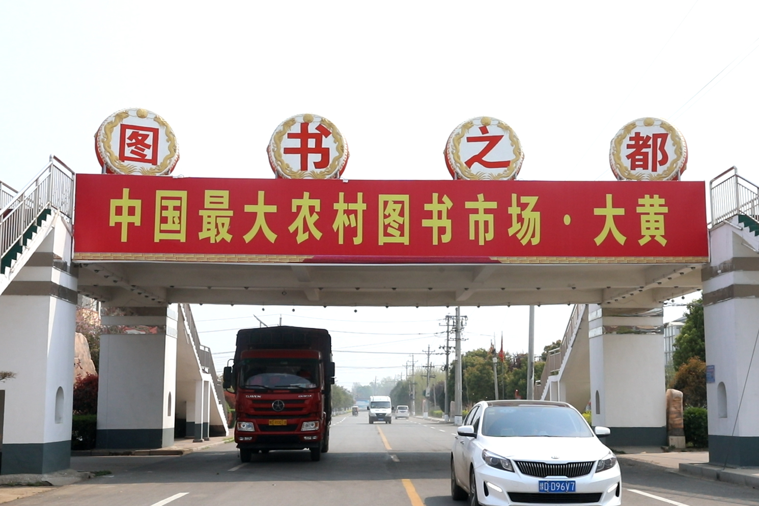 在图书批发市场商铺入口处,写有“图书之都 中国最大农村图书市场·大黄”的牌子就挂在过街天桥上。图书市场由统一规划的商铺组成,市场内没有其他商品,所有商铺里都堆放着书籍,文史、经济,各种书籍琳琅满目,数量之多、种类之全让人惊叹。