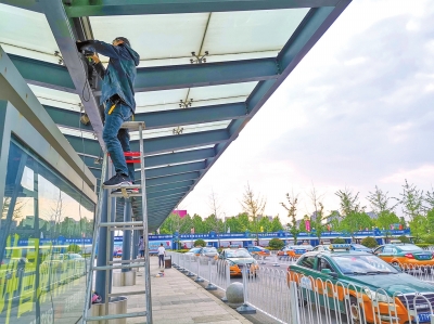 昨天,该站出租车乘车区,施工人员安装摄像头。