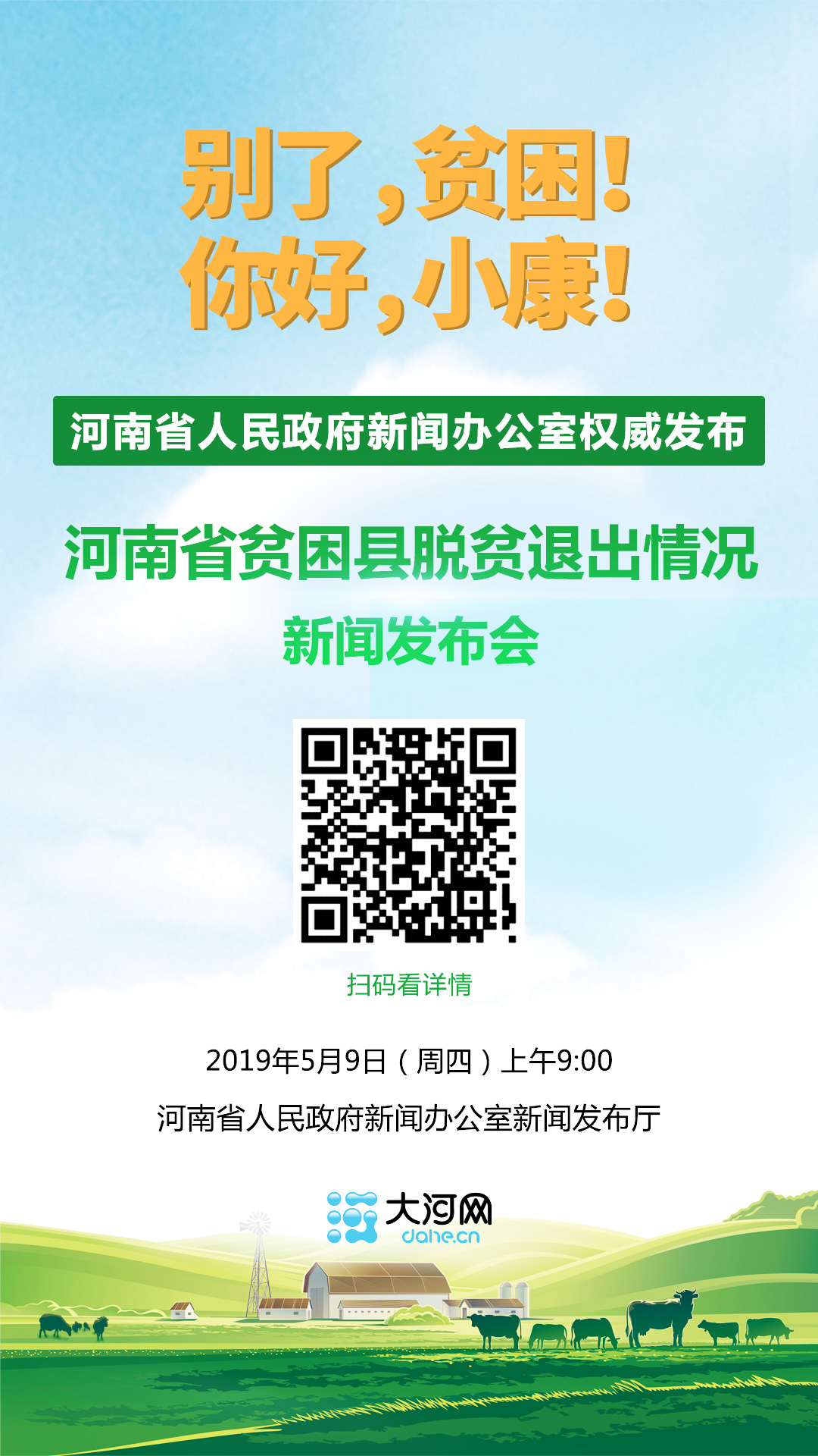 继2016年、2017年兰考县等6个贫困县成功脱贫摘帽后,河南又有33个县脱贫摘帽!上午9点权威发布,大河网将全程直播,敬请关注。