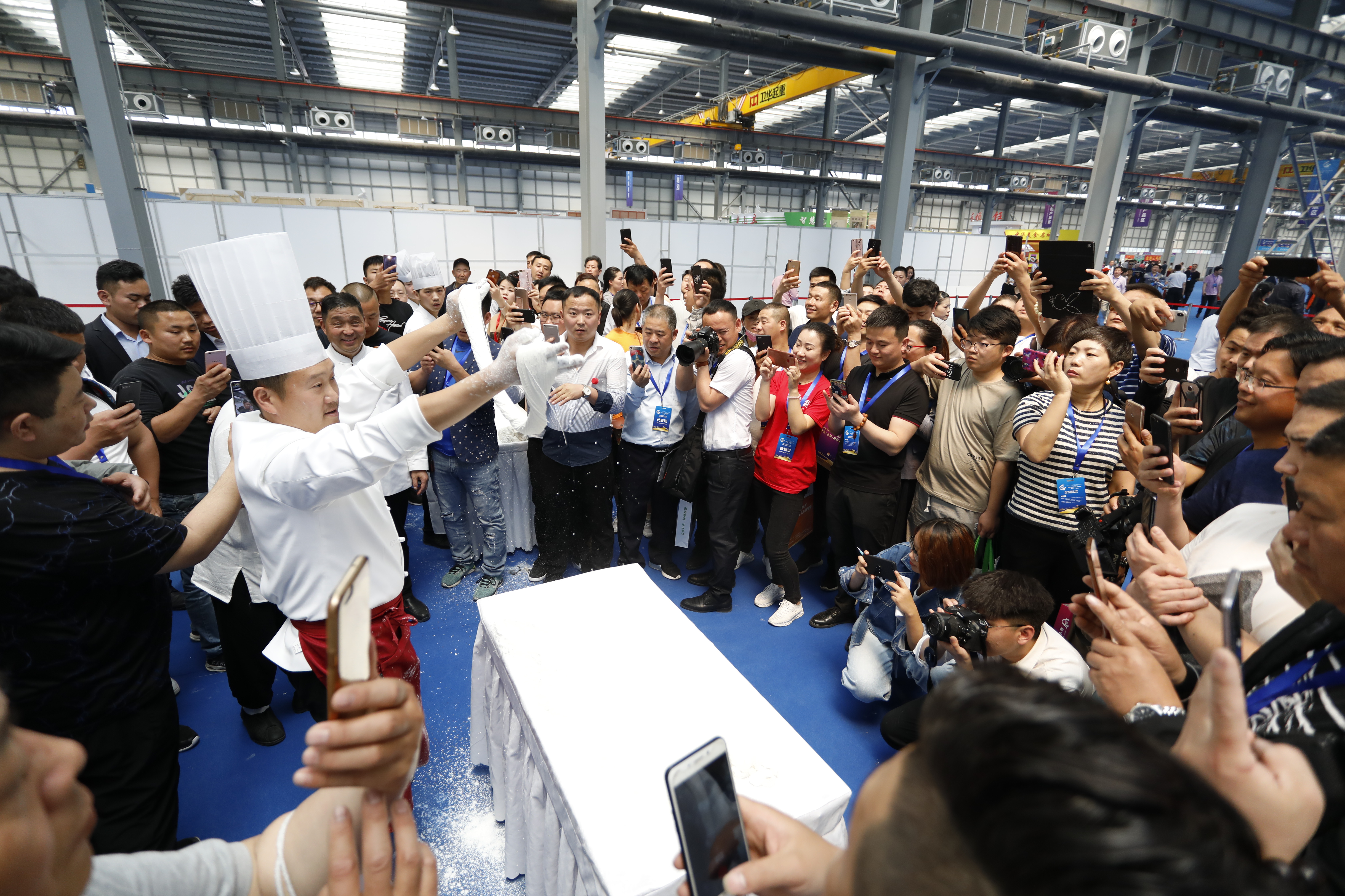 现场名厨正在展示拉面,细可穿针,入水即化,一点即燃。