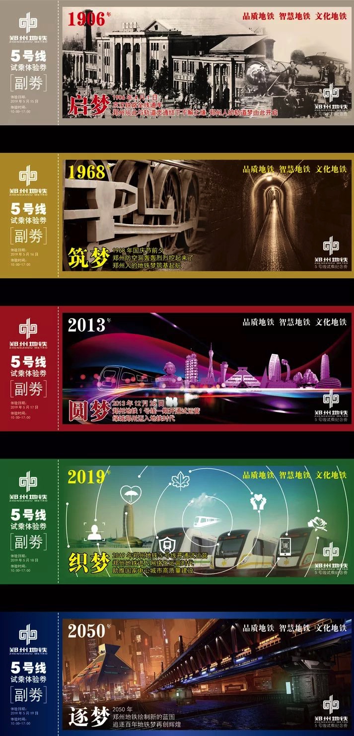 5号线试乘券以“启梦、筑梦、圆梦、织梦、逐梦”为系列主题,以郑州城市发展与轨道交通建设相辅相成的促进关系为脉络,展现了郑州地铁为助力郑州国家中心城市建设和中原更加出彩做出的贡献和梦想。