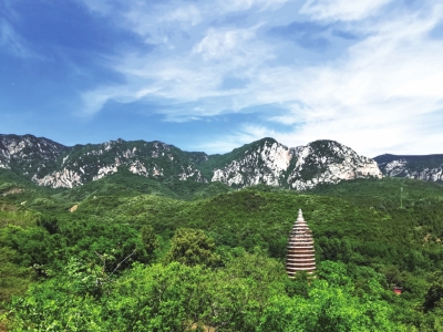 脚下的小径,杜甫、白居易都曾走过。向东远眺,山势起伏绵延,嵩岳寺塔从郁郁葱葱的植被绿海里涌出,与一里外的法王寺塔遥遥相望。白居易曾在《夜从法王寺归嵩岳寺》里写道,“双刹夹虚空,绿云一径通”,这样的景色跨越千年仍在眼前,幸哉!