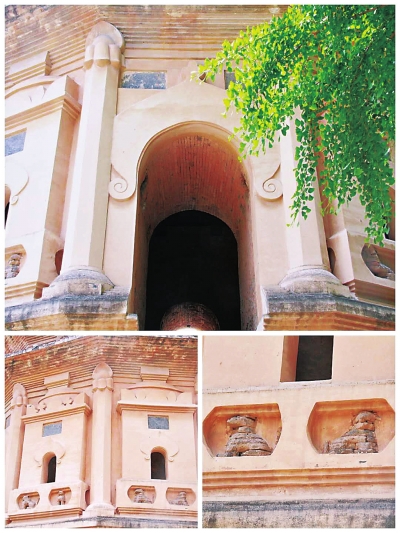没错。全塔最富装饰的第一层塔身,转角处各砌出半隐半露的倚柱,柱头饰火焰宝珠与覆莲,两柱间,各砌一座单层方塔状的壁龛,其中有雕砖狮16个,姿态各异,典型的印度狮子造像风格。龛顶类似山花蕉叶的装饰,圆拱开口上方的火焰形门楣,都是古印度元素。