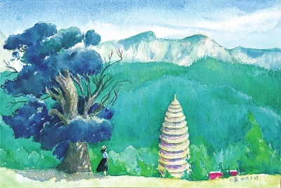 他们几人在嵩岳寺塔下回味历史,我则迫不及待地回到当年相同位置,拿出来水彩颜料,再次画下嵩岳寺塔。这十几年来一直坚持画画和创作,更喜欢感受外出写生时的专注。山中初夏的风正凉爽,天空中的卷云像是大笔刷出来般,钴蓝的天蓝得让人欢喜。写生这个把小时,与一切电子产品隔绝,在大自然中静享,风从身边经过,把竹叶挠得簌簌响……