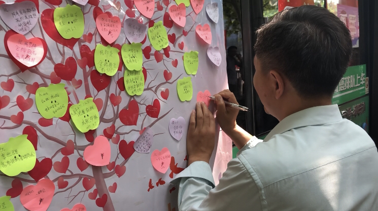 除了考生家长外,在河南省四十七中学校门口左手边可以看到一辆停放两天的“985路”公交车,这辆公交车车身上有一个手工制作的精美心愿墙,郑州公交志愿者告诉大河网记者,“这是一面充满爱的心愿墙,上面有着两天以来社会人士对考生的祝愿,更多的是家长们对孩子的希望。公交车是985路,与'985院校'完美契合,这样做就是让社会各界人士为高考考生加油打气的一种表达方式。”