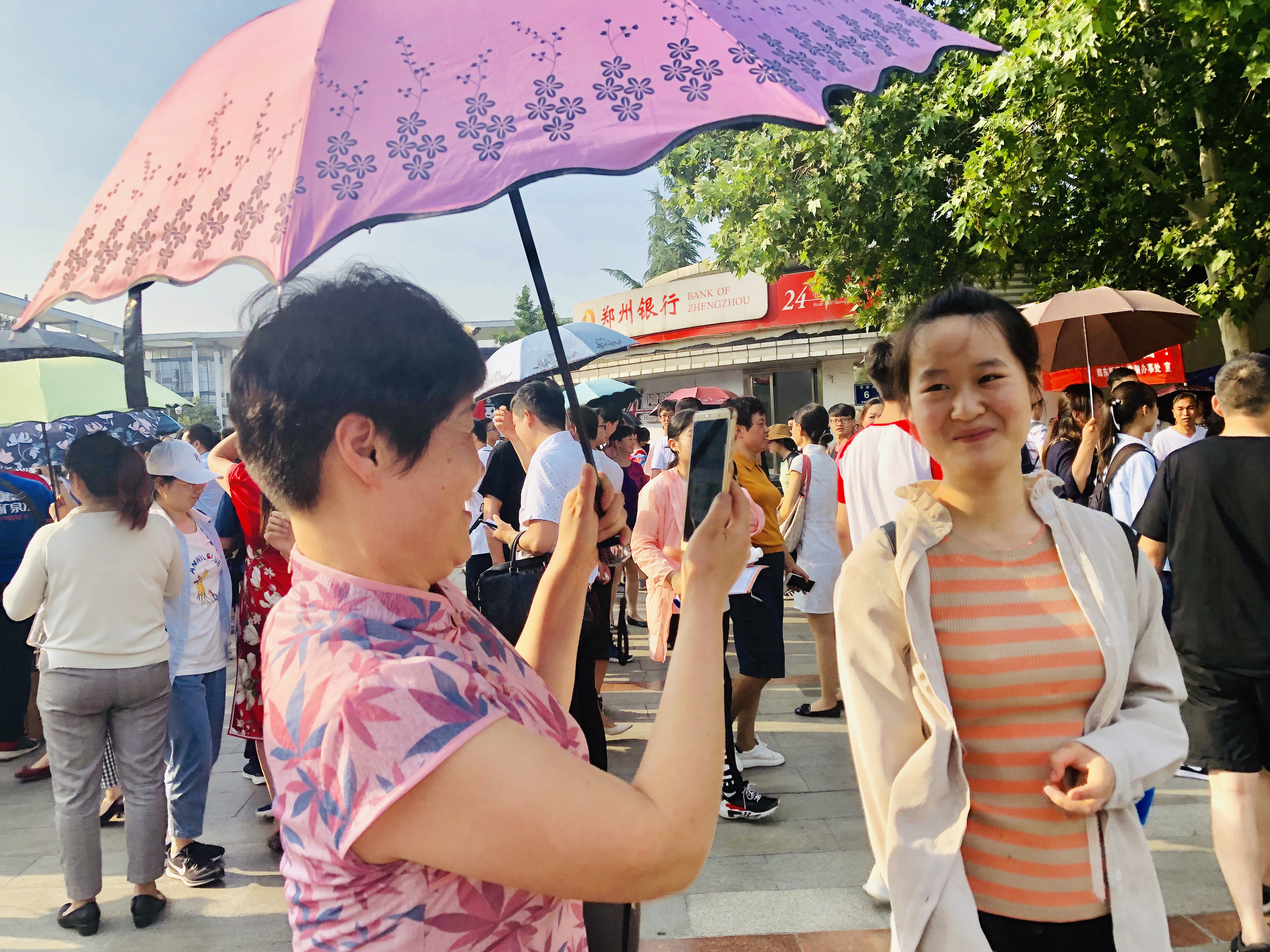 妈妈用手机记录女儿走出考场时美丽的笑容
