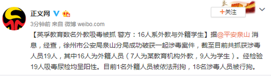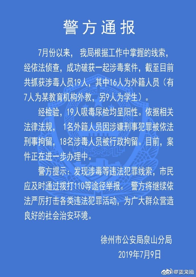 据@平安泉山消息,经查,徐州市公安局泉山分局成功破获一起涉毒案件,截至目前共抓获涉毒人员19人,其中16人为外籍人员(7人为某教育机构外教,9人为学生)。经检验19人吸毒尿检均呈阳性。目前1名外籍人员被依法刑拘,18名涉毒人员被行拘。