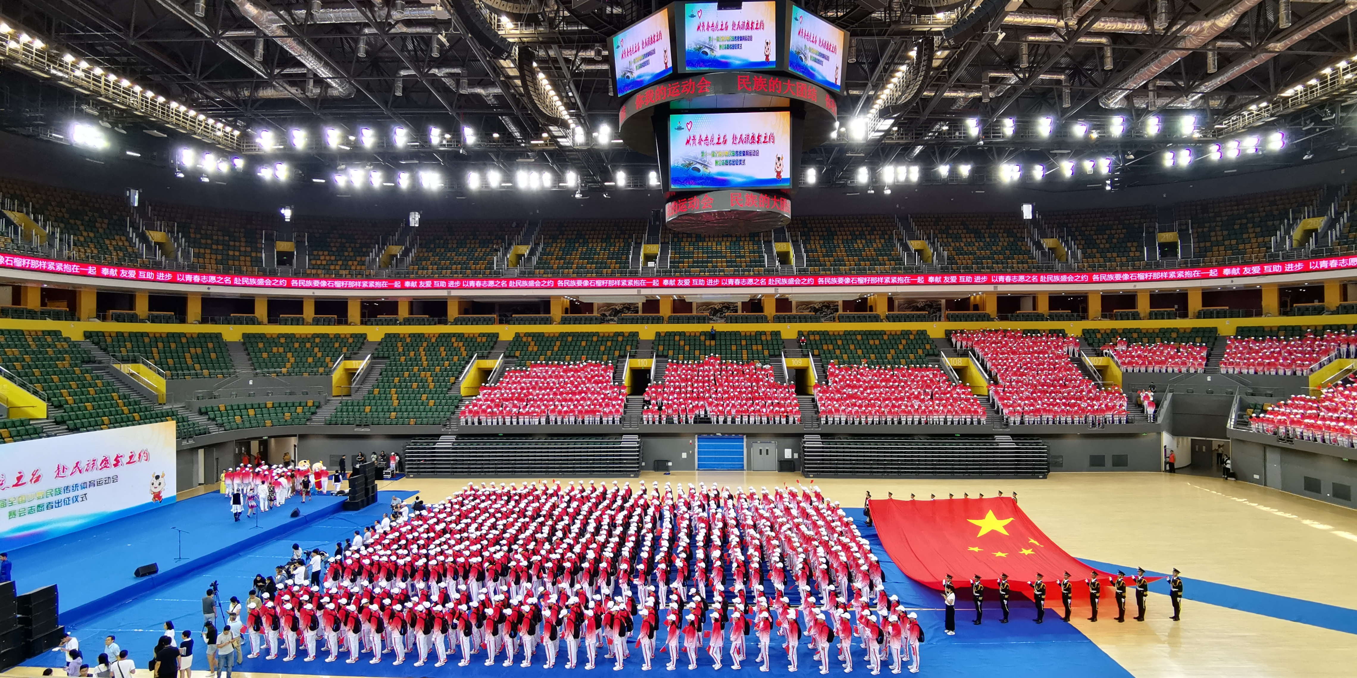 展现赛会志愿者饱满热情和旺盛干劲的视频《以青春志愿之名 赴民族盛会之约》拉开本次出征仪式序幕后,与会领导向服务本届全国民族运动会开闭幕式的九支赛会志愿者支队授旗,来自20余个少数民族的170余名赛会志愿者代表组成的“石榴籽”志愿者服务队亮相,他们身着自己民族的节日盛装,用本民族的语言说出“ 民族的大团结,你我的运动会”。