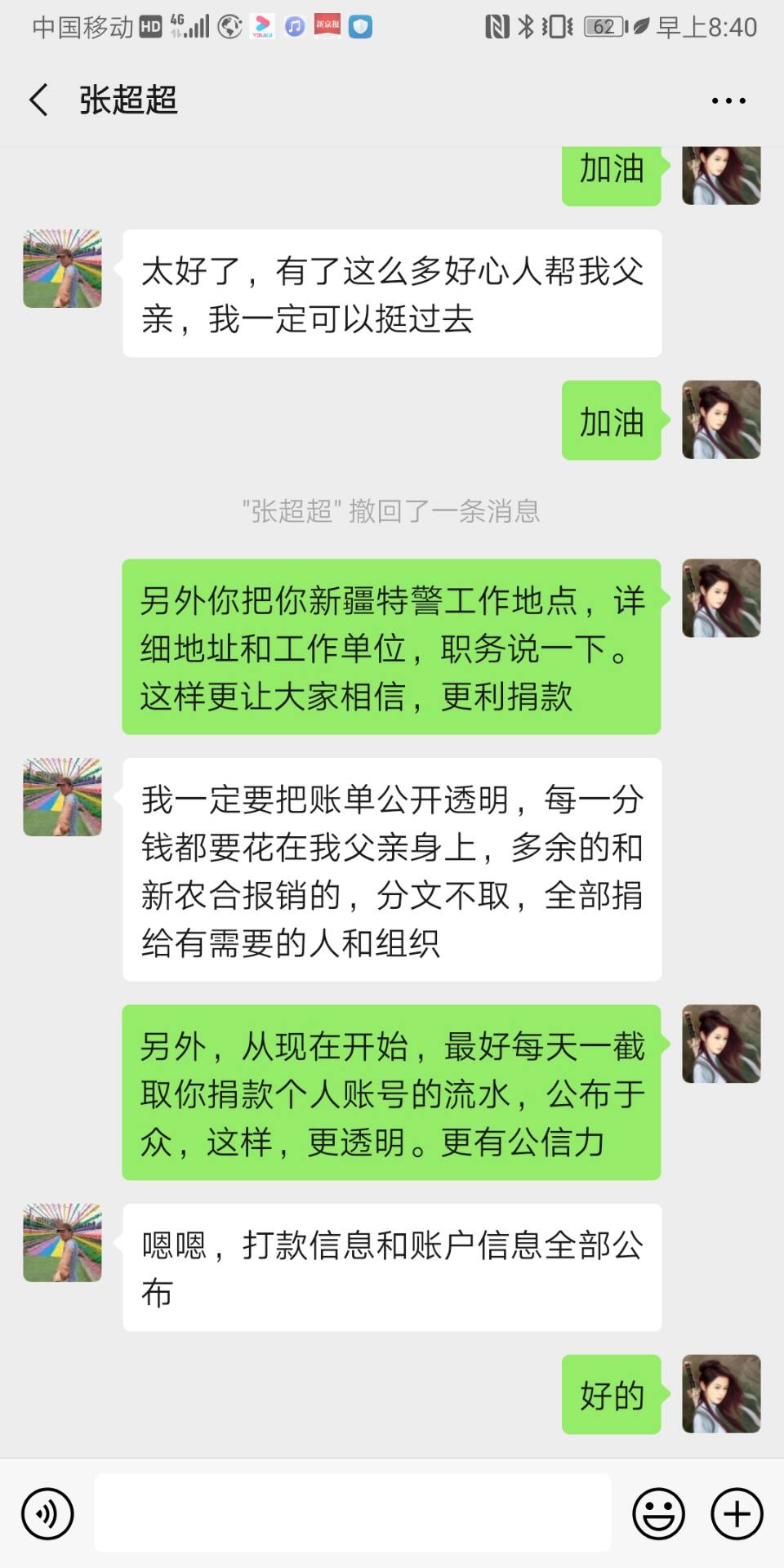 “我一定要把账单公开透明,每一分钱都要花在我父亲身上,多余的和新农合报销的,分文不取,全部捐给有需要的人和组织。”大河报•大河客户端公布其个人账户后,张超超向大河报•大河客户端记者说。而在此之前,大河报•大河客户端也要求其每天都要公布其个人账户流水,以公开透明。