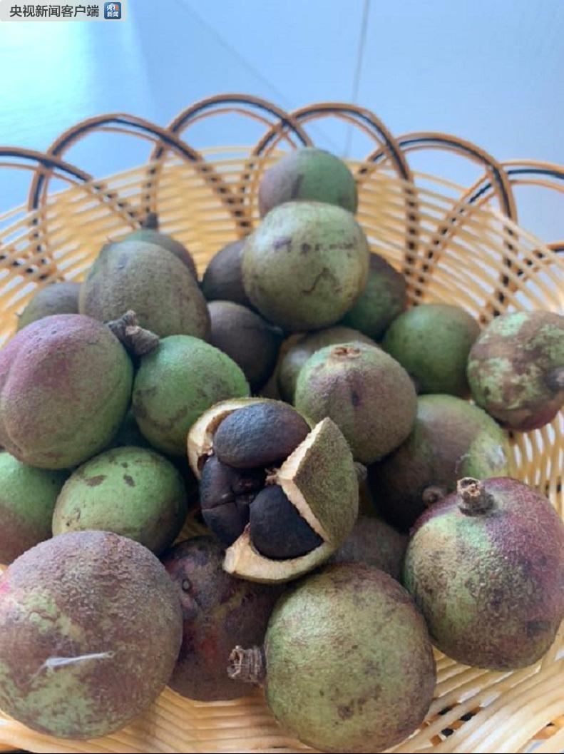 △油茶果和油茶籽。果实经过晾晒裂开,其中的油茶籽用来榨油。晒干的茶壳可以提取木糖醇、活性炭、有机肥等。(央视记者许达拍摄)