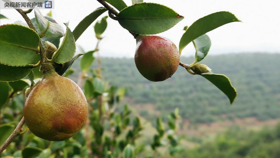 △油茶果成熟要经历五个季节,经常呈现花果同树的景象,当地人称为“抱子怀胎”。除了观赏,油茶花还是很好的蜜源。(央视记者张晓鹏拍摄)