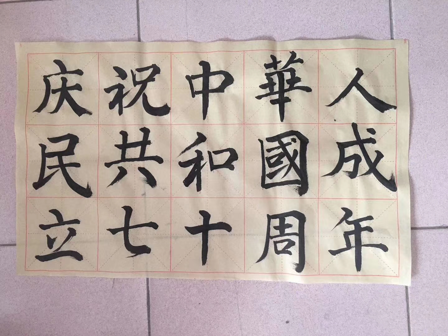 都说国很大,其实一个家;一心装满国,一手撑起家。对于信阳市郝堂村图书管理员詹丽来说,10月1日更是意义非凡,因为这天不仅是祖国的生日,也是她父亲的生日。生日当天,年近古稀的詹丽父亲手持毛笔激动地写下“我和祖国同一天生日,幸福快乐”“庆祝中华人民共和国成立70周年”两幅书法作品。