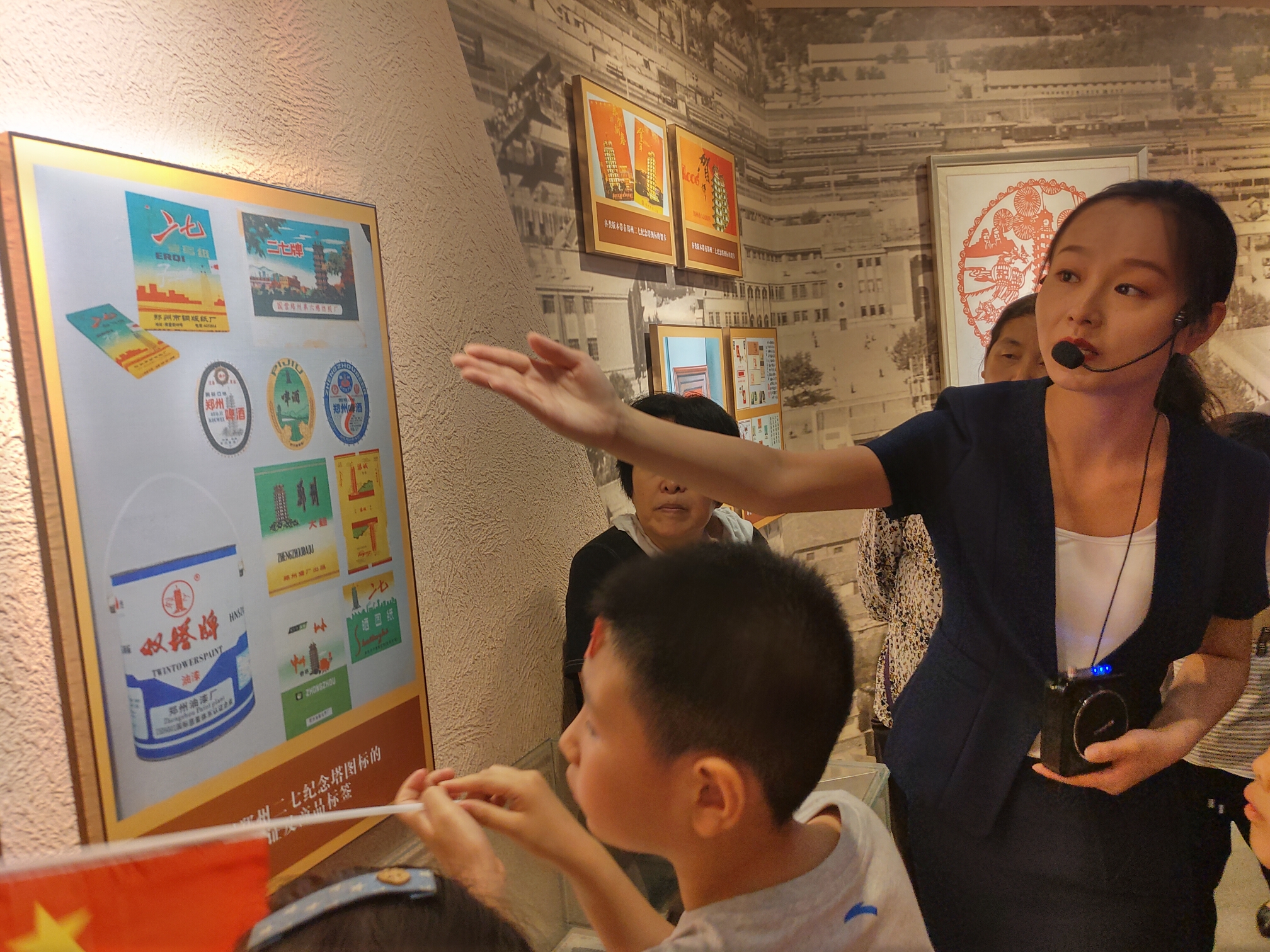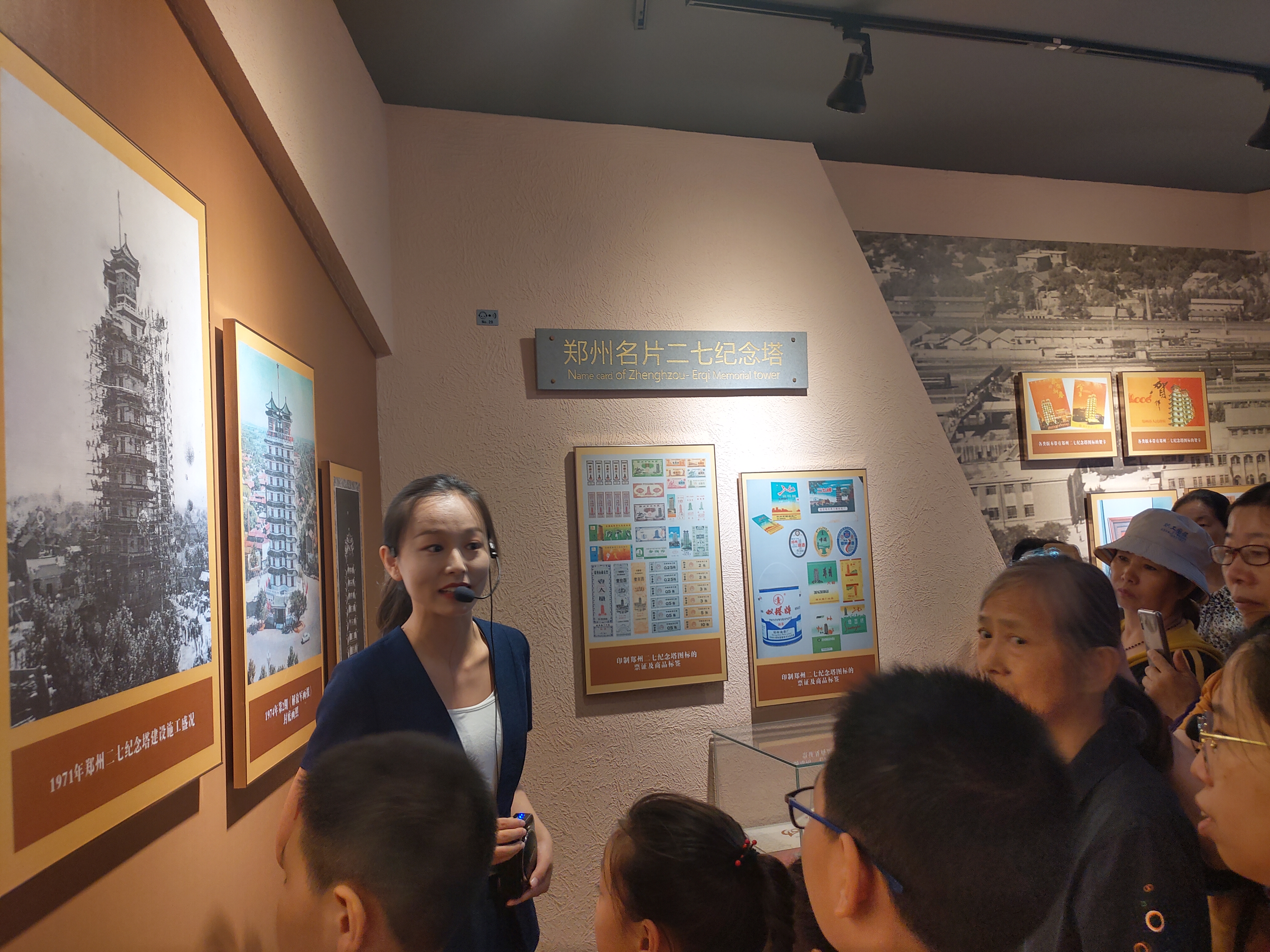10月3日,郑州二七纪念塔内游人如织,在塔内第二展厅,讲解员高梦迪耐心地向游客介绍二七大罢工发生的历史背景。
