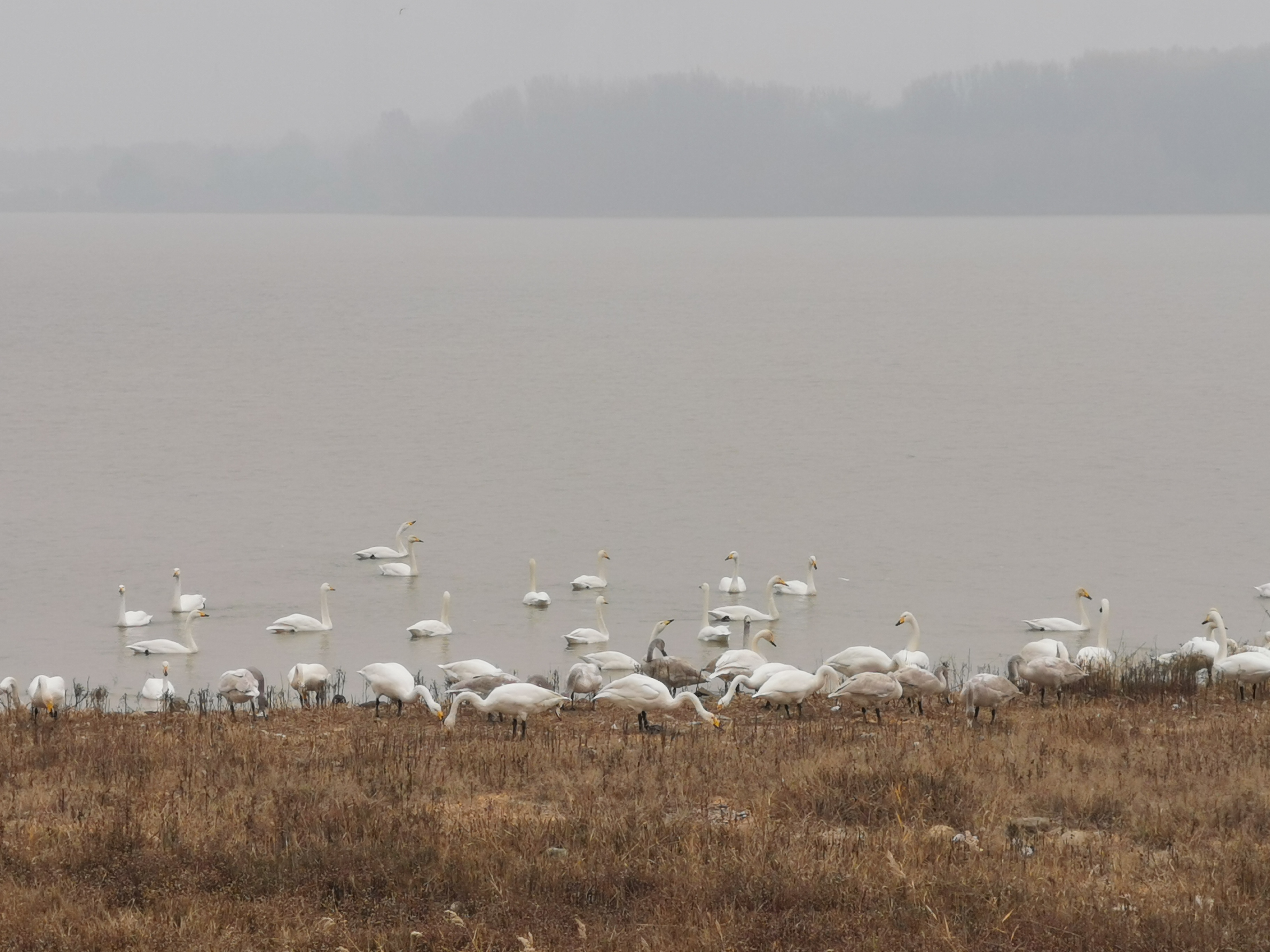 今年由于前期气温过高,白天鹅的大部队比往年来得要晚10天左右。目前,到达三门峡天鹅湖国家城市湿地公园越冬的白天鹅数量有400只左右。