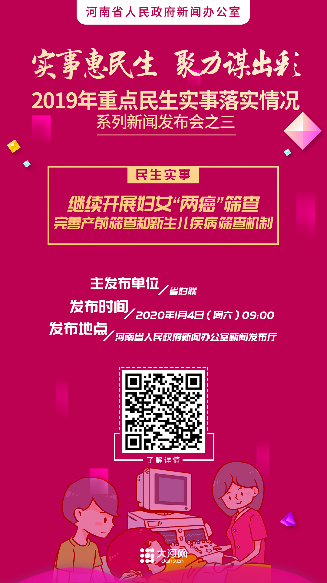大河网讯(政务记者 申华)使患病妇女得到及时救助和规范治疗,提早发现高风险孕妇,降低出生缺陷的发生……河南省委省政府连续3年将提高妇女儿童健康保障水平列入重点民生实事,1月4日,省政府新闻办召开2019年重点民生实事落实情况系列新闻发布会的第三场,向社会通报“继续开展妇女‘两癌’筛查,完善产前筛查和新生儿疾病筛查机制”民生实事落实情况。