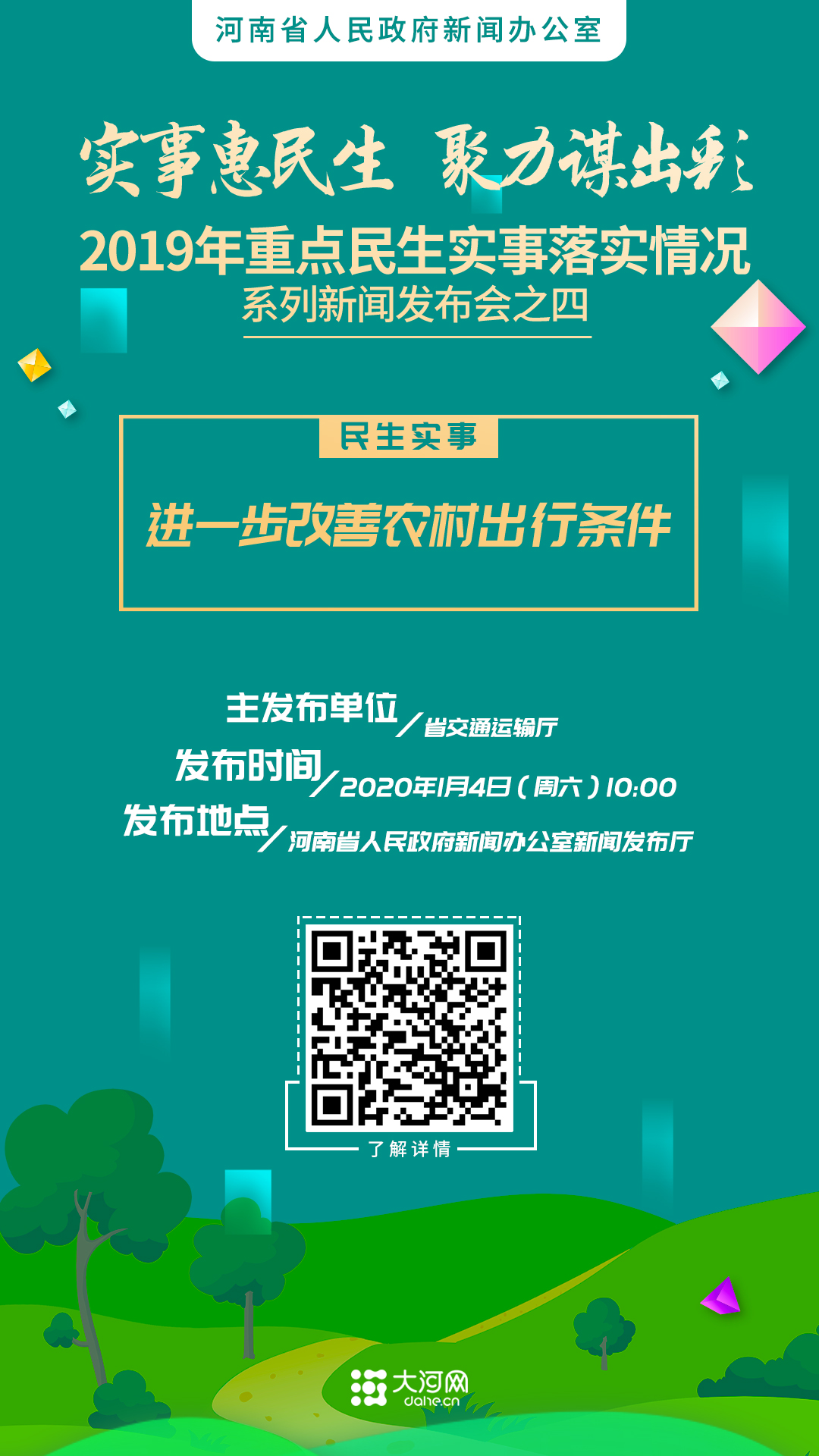 大河网讯(政务记者 申华)“出门硬化路、雨天不踩泥、抬脚上客车、物流到家门”,四通八达的“四好农村路”正改变着广大农村群众的生活。1月4日,河南省政府新闻办召开2019年重点民生实事落实情况系列新闻发布会的第四场,向社会通报“进一步改善农村出行条件”民生实事落实情况。