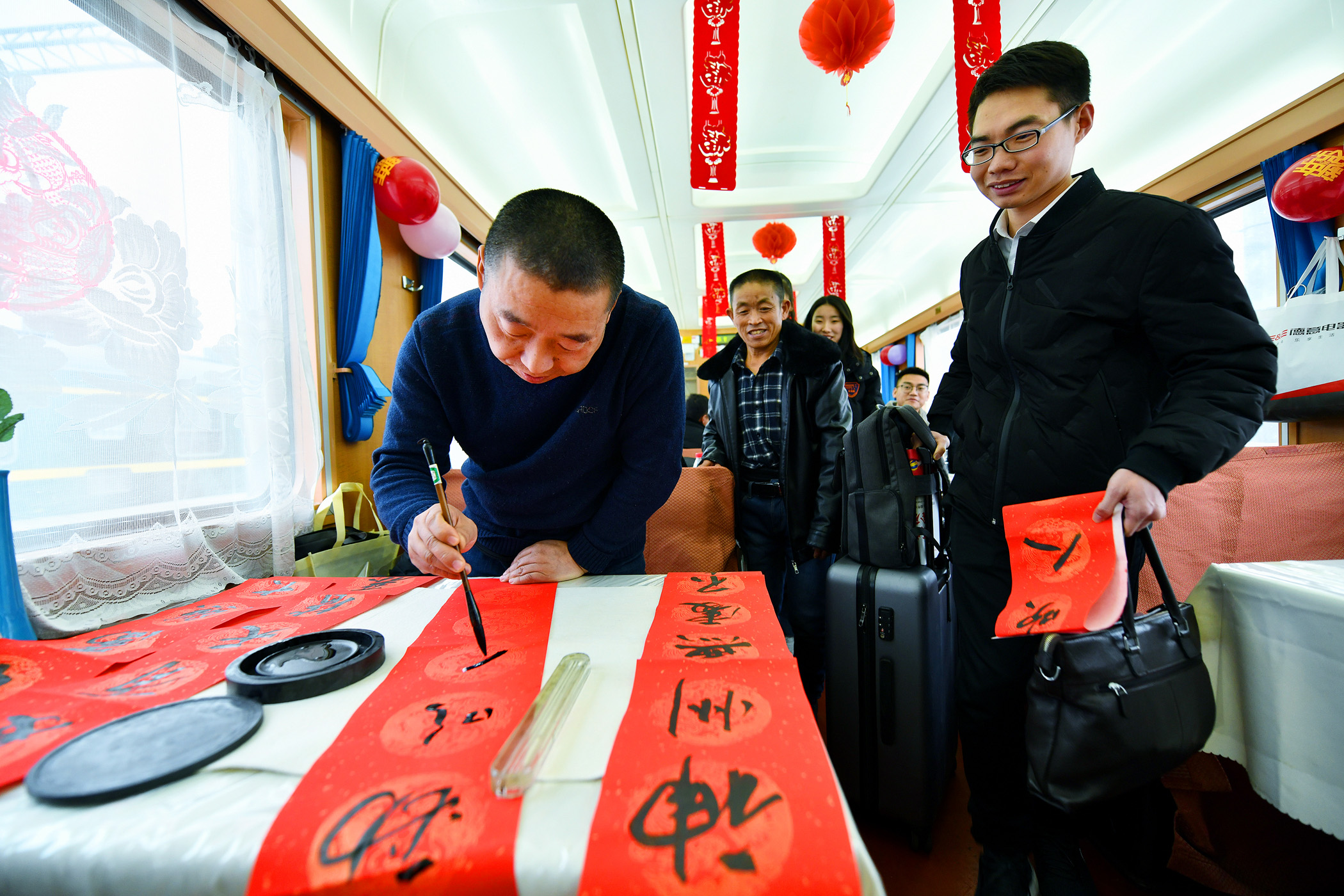 “在我的记忆中,绿皮车一直都是拥挤杂乱的代名词,可这趟车却十分温馨整洁,处处都能感受到过年的氛围,乘务员费心了!”列车餐车里,从杭州返乡的河南籍旅客刘博博从春运青年志愿者手中接过铁路书协会员现写的春联,高兴得合不拢嘴。只是刘博博不曾想到,眼前的乘务员和青年志愿者都是从铁路工务部门“跨界”抽调的门外汉——他们平时身着黄马褂保养维护线路,春运期间又穿上铁路制服担当乘务工作。