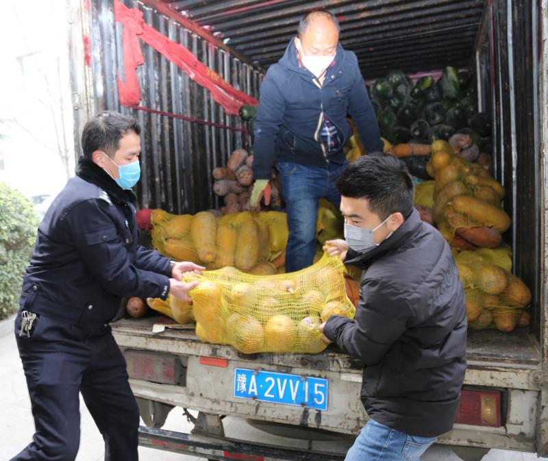 大河网讯 (记者 宋向乐)2月4日上午,冬瓜、南瓜、萝卜等满满一车蔬菜被拉到了郑州市公安局交警支队,这些蔬菜是热心市民郭利闯自费购买的,用来慰问抗击疫情的一线交警。