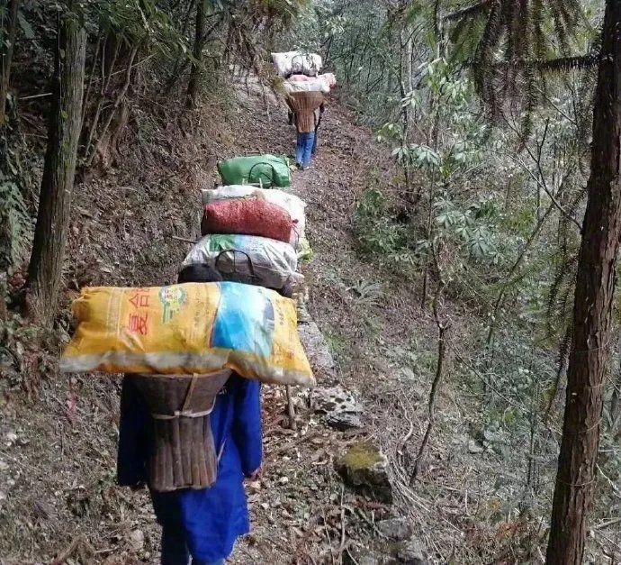 很多人背着菜篓走十几公里山路