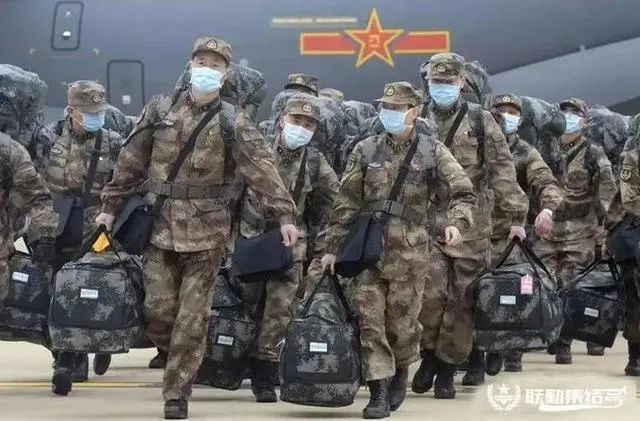 2月13日,丁盛(最前排)和战友走下飞机。图源:联勤集结号微信公号