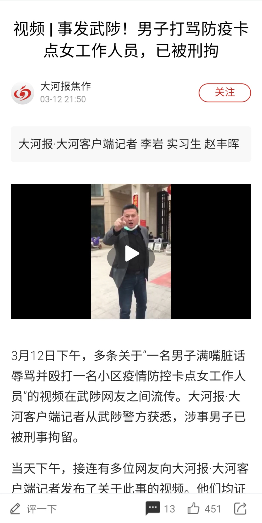 武陟一男子无视法律威严,肆意辱骂殴打疫情防控国家工作人员,严重影响和干扰了防疫工作。