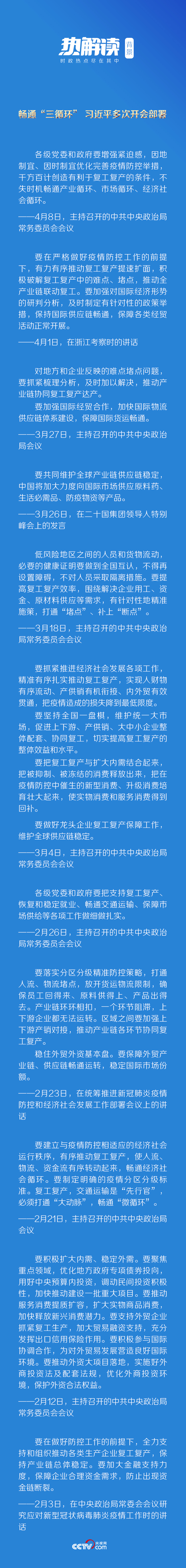 4月8日,习近平总书记主持召开中共中央政治局常务委员会会议时指出,要坚持在常态化疫情防控中加快推进生产生活秩序全面恢复。会议同时强调,各级党委和政府要增强紧迫感,因地制宜、因时制宜优化完善疫情防控举措,千方百计创造有利于复工复产的条件,不失时机畅通产业循环、市场循环、经济社会循环。
