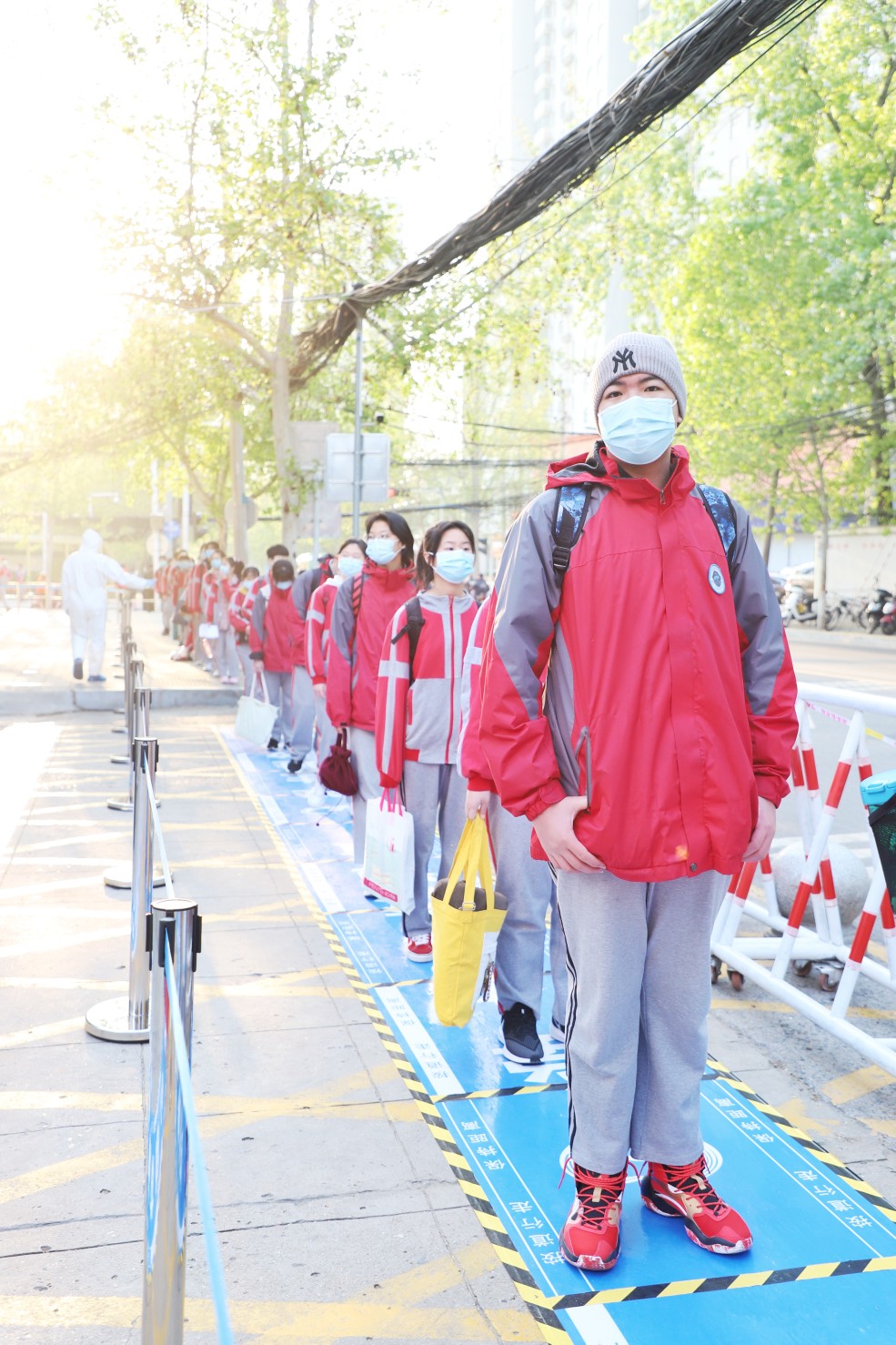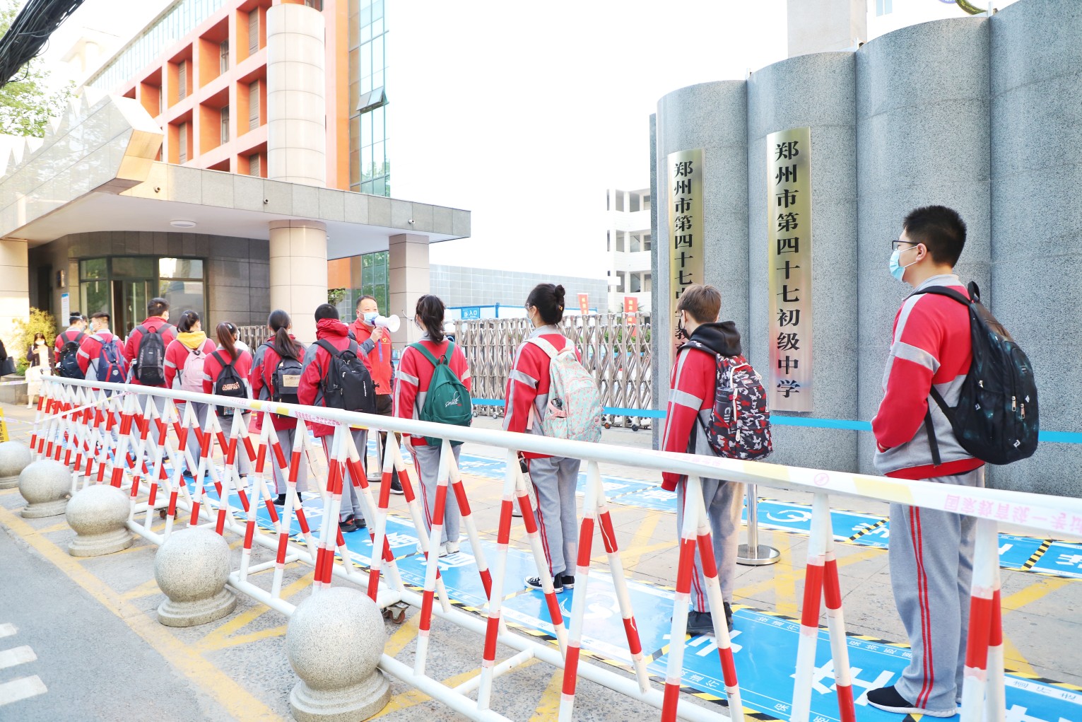 上午7时许,郑州市第四十七初级中学初三年级学生正在有序返校。该校初三年级有12个班,实行分班级、分时段错峰入校,负责接送的家长不下车,不得靠近学校警戒线之内。