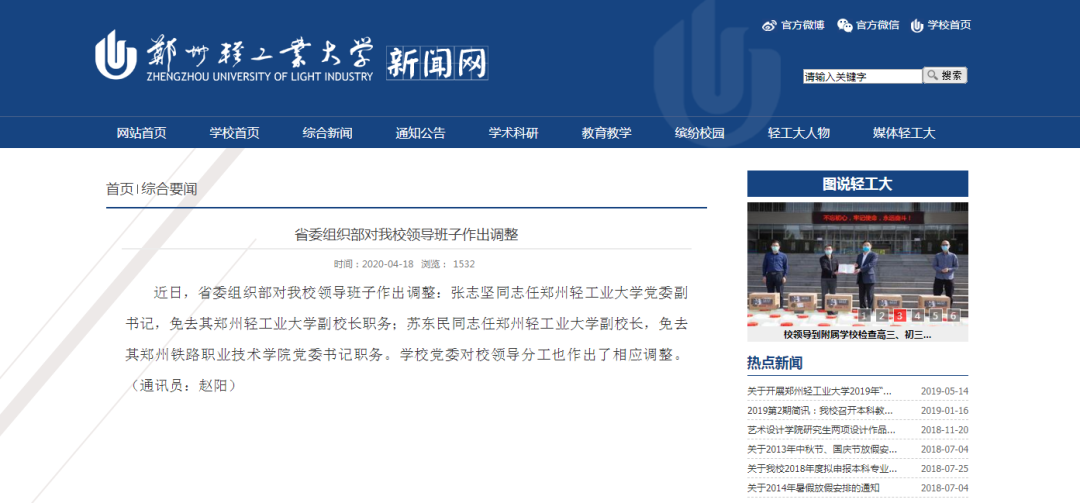 近日,省委组织部对郑州轻工业大学领导班子作出调整:张志坚同志任郑州轻工业大学党委副书记,免去其郑州轻工业大学副校长职务;苏东民同志任郑州轻工业大学副校长,免去其郑州铁路职业技术学院党委书记职务。学校党委对校领导分工也作出了相应调整。