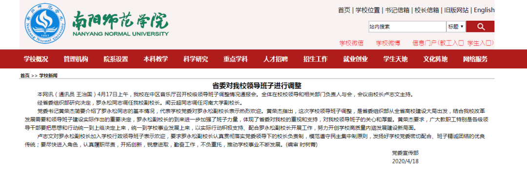 经省委组织部研究决定,罗永松同志调任南阳师范学院副校长。阚云超同志调任河南大学副校长。