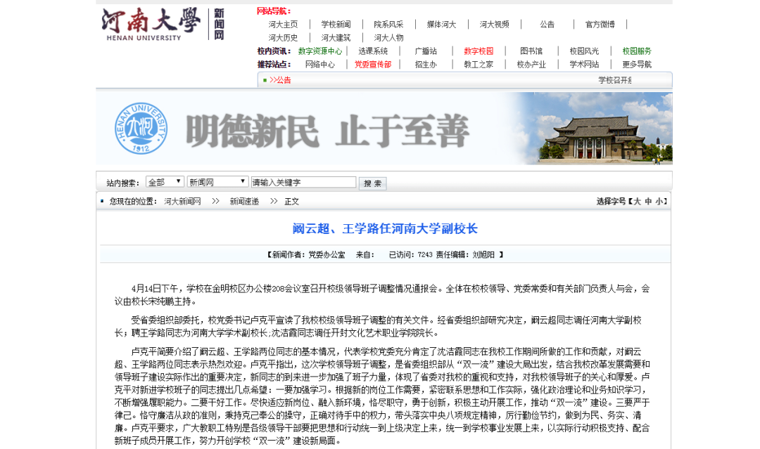 受省委组织部委托,校党委书记卢克平宣读了河南大学校级领导班子调整的有关文件。经省委组织部研究决定,阚云超同志调任河南大学副校长;聘王学路同志为河南大学学术副校长;沈洁霞同志调任开封文化艺术职业学院院长。