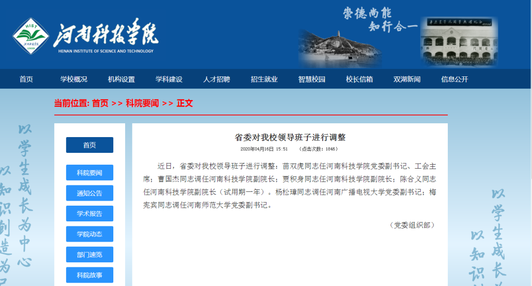 近日,省委对河南科技学院领导班子进行调整:苗双虎同志任河南科技学院党委副书记、工会主席;曹国杰同志调任河南科技学院副院长;贾积身同志任河南科技学院副院长;陈合义同志任河南科技学院副院长(试用期一年)。杨松璋同志调任河南广播电视大学党委副书记;梅宪宾同志调任河南师范大学党委副书记。