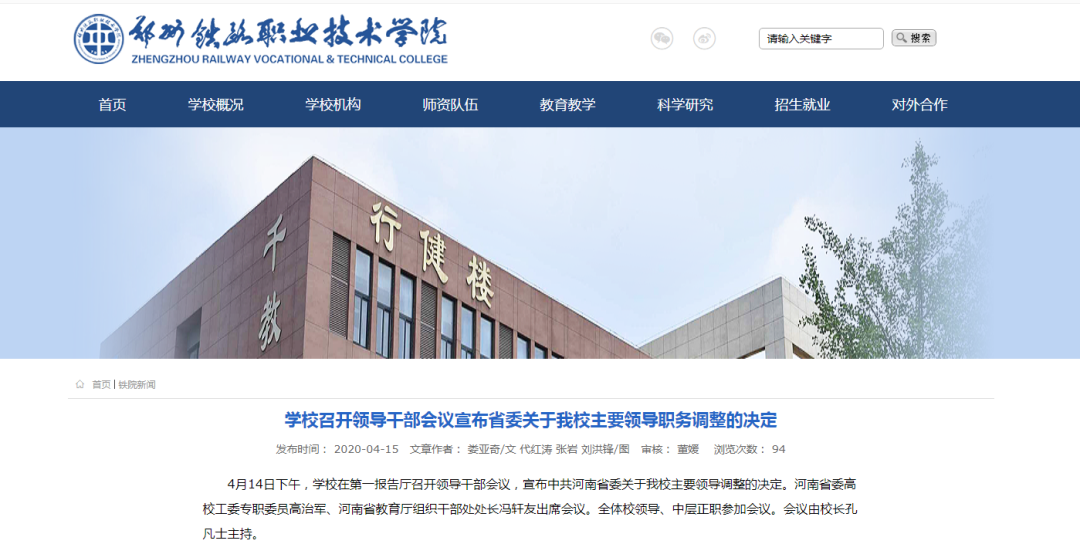 冯轩友宣读了中共河南省委组织部关于郑州铁路职业技术学院主要领导调整的决定:许琰同志任郑州铁路职业技术学院党委书记,免去其黄河水利职业技术学院党委书记职务;苏东民同志任郑州轻工业大学副校长,免去其郑州铁路职业技术学院党委书记职务。