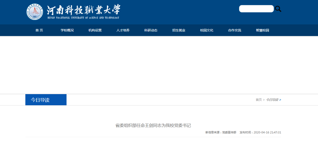 2020年4月13日,河南工业职业技术学院在孔明路校区学术报告厅召开领导干部大会,宣布省委组织部关于河南工业职业技术学院校长的任命决定。省委军民融合发展委员会办公室常务副主任唐远游、副主任袁玉新、机关纪委书记柴志芳出席会议,学校党委委员及全体中层干部参加会议。