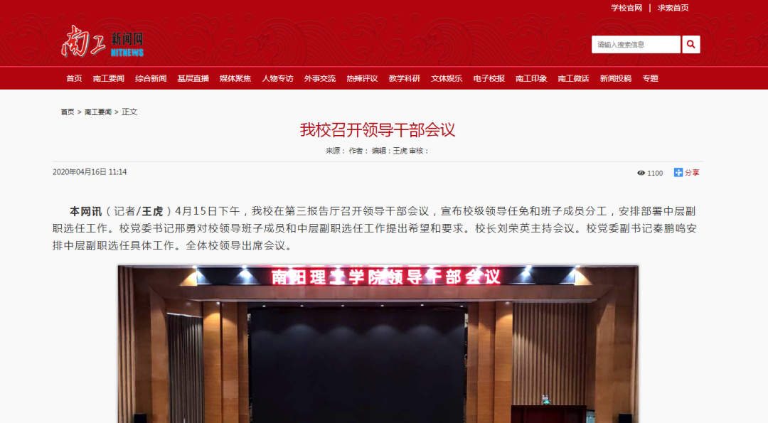 4月15日下午,南阳理工学院在第三报告厅召开领导干部会议,宣布校级领导任免和班子成员分工,安排部署中层副职选任工作。校党委书记邢勇对校领导班子成员和中层副职选任工作提出希望和要求。校长刘荣英主持会议。校党委副书记秦鹏鸣安排中层副职选任具体工作。全体校领导出席会议。