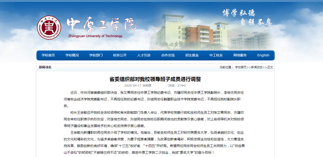 近日,中共河南省委组织部决定,张艾青同志任中原工学院纪委书记、方建印同志任中原工学院副院长,李俊杰同志任河南牧业经济学院党委副书记,不再担任中原工学院纪委书记,孙斌同志任鹤壁职业技术学院党委书记,不再担任中原工学院副院长职务。