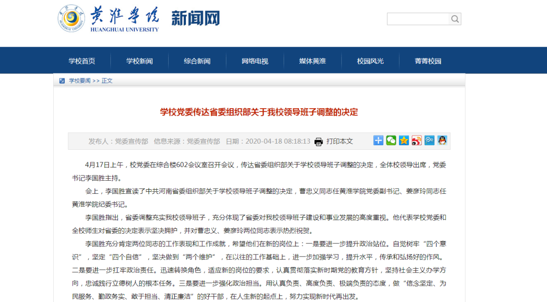 会上,李国胜宣读了中共河南省委组织部关于学校领导班子调整的决定,曹忠义同志任黄淮学院党委副书记、姜彦玲同志任黄淮学院纪委书记。