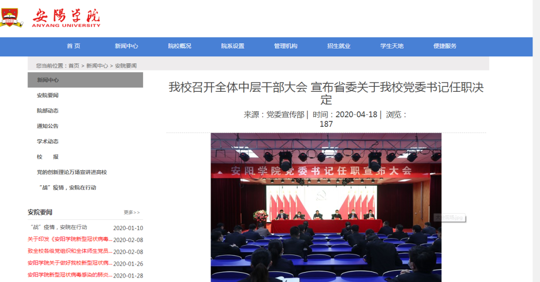 4月16日上午,安阳学院在综合楼音乐厅召开全体中层干部大会,宣布省委关于安阳学院党委书记任职的决定。河南省委高校工委专职委员高治军,河南省委高校工委、省教育厅组织干部处处长、一级调研员冯轩友,河南省委高校工委、省教育厅人事处一级调研员姜楠出席大会。安阳学院领导班子全体成员及全校中层干部参加会议,大会由春来教育集团副董事长杨新忠主持。