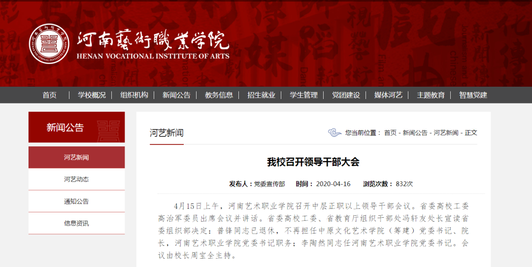 4月15日上午,河南艺术职业学院召开中层正职以上领导干部会议。省委高校工委高治军委员出席会议并讲话。省委高校工委、省教育厅组织干部处冯轩友处长宣读省委组织部决定:普锋同志已退休,不再担任中原文化艺术学院(筹建)党委书记、院长,河南艺术职业学院党委书记职务;李陶然同志任河南艺术职业学院党委书记。会议由校长周宝全主持。