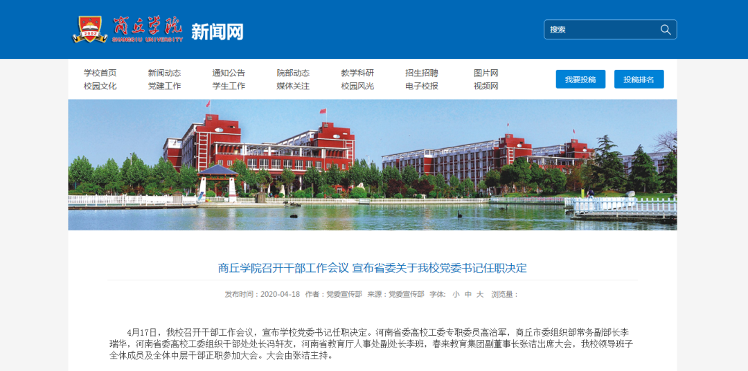 4月17日,商丘学院召开干部工作会议,宣布学校党委书记任职决定。河南省委高校工委专职委员高治军,商丘市委组织部常务副部长李瑞华,河南省委高校工委组织干部处处长冯轩友,河南省教育厅人事处副处长李班,春来教育集团副董事长张洁出席大会,学校领导班子全体成员及全体中层干部正职参加大会。大会由张洁主持。