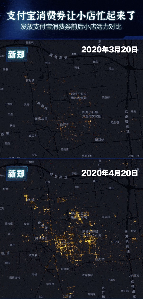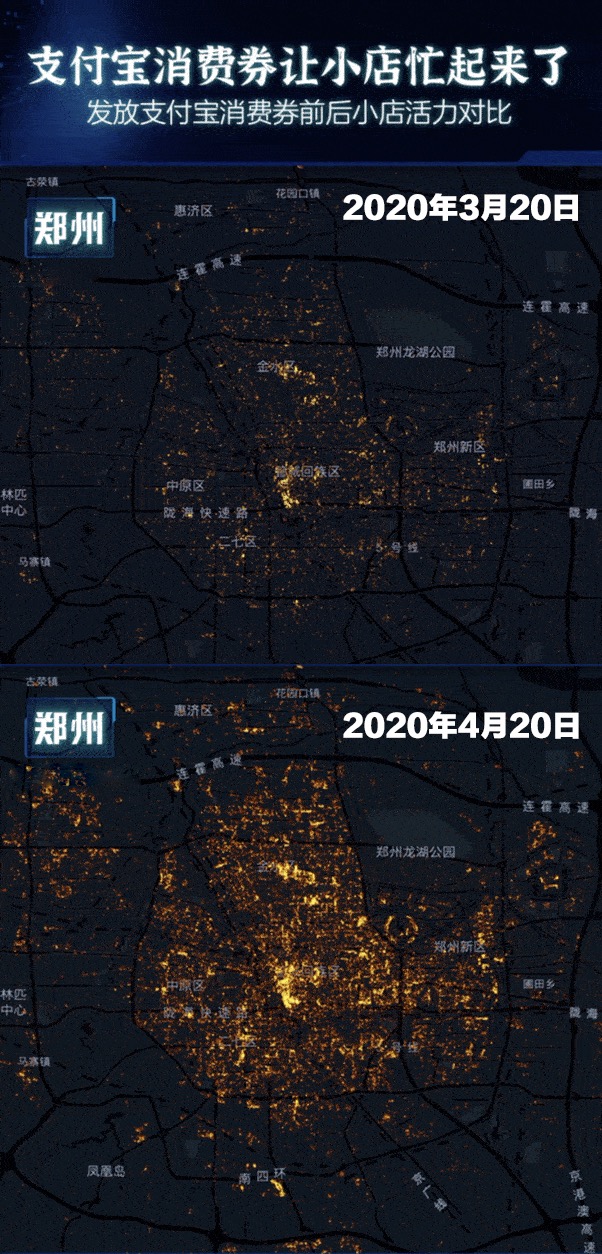 从阿里巴巴提供的消费券发放前后(3月20日和4月20日)小店活力对比亮灯率对比图上可以看出,郑州市主要亮灯区域范围北至连霍高速,南到南三环,东到东四环,西至郑州绕城高速,其中以金水区和管城区最“闪亮”。而新郑市主要亮灯区域集中在郑州工业应用技术学院、新郑市轩辕湖湿地文化园和郑风苑景区附近。