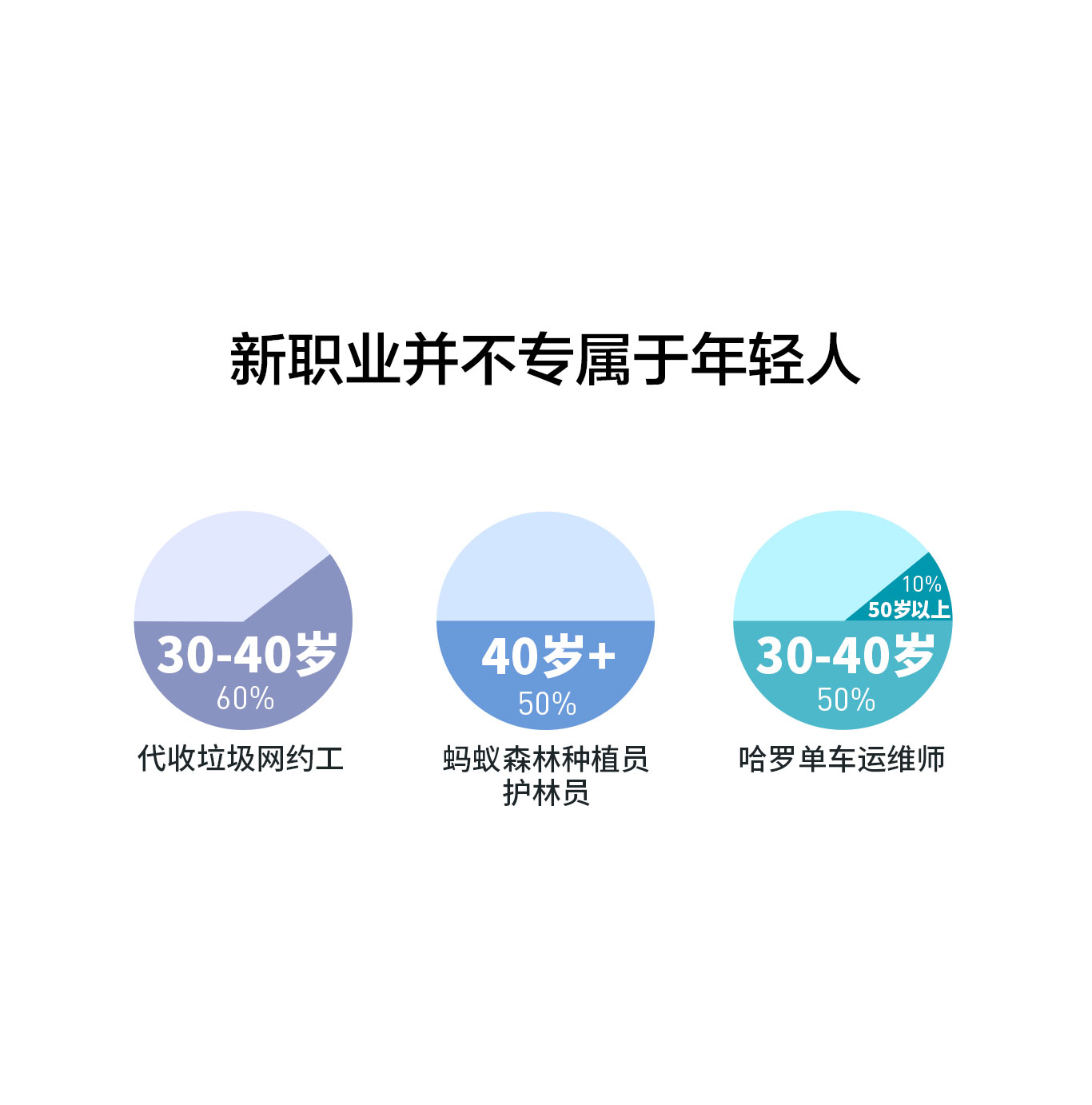 此外,新职业并不是年轻人的专属。为蚂蚁森林用户在内蒙古、甘肃等荒漠地区种下真树的18万人次种植员和护林员,全是当地牧民和农民,一半以上年龄超过四十岁。哈啰的“单车猎人”,一半年龄在30—40岁之间,还有10%年龄在50岁以上。