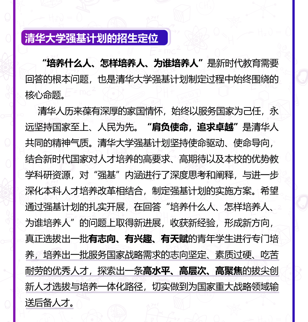 为全面贯彻全国教育大会精神,深入落实《国务院关于深化考试招生制度改革的实施意见》,根据《关于在部分高校开展基础学科招生改革试点工作的意见》、《清华大学综合改革方案》等文件精神,服务国家重大战略需求,加强基础学科拔尖创新人才选拔培养,清华大学2020年开展基础学科招生改革试点(以下简称“强基计划”)。基于我校“为国选材、厚植强基、拔尖领军、创新未来”的强基人才选拔培养定位,结合办学特色和人才培养目标,选拔一批肩负使命、志趣坚定、禀赋优异的青年学生进行专门培养,为国家基础学科和重大战略领域输送后备人才。
